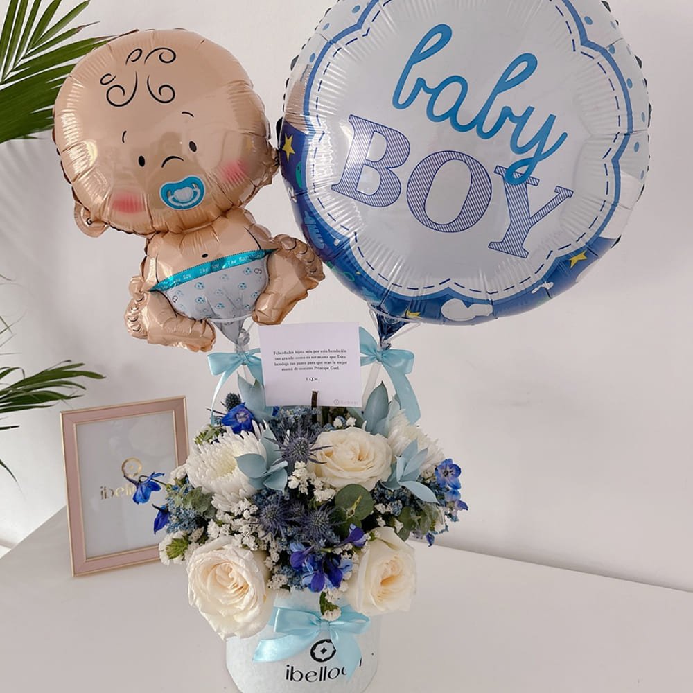 Un detalle delicado para celebrar la llegada de un nuevo amor. Flores frescas en un cilindro celeste, crema o rosado, acompañadas por globos foil y un tierno globo de bebé (según disponibilidad). Todo pensado para dar la bienvenida con dulzura.